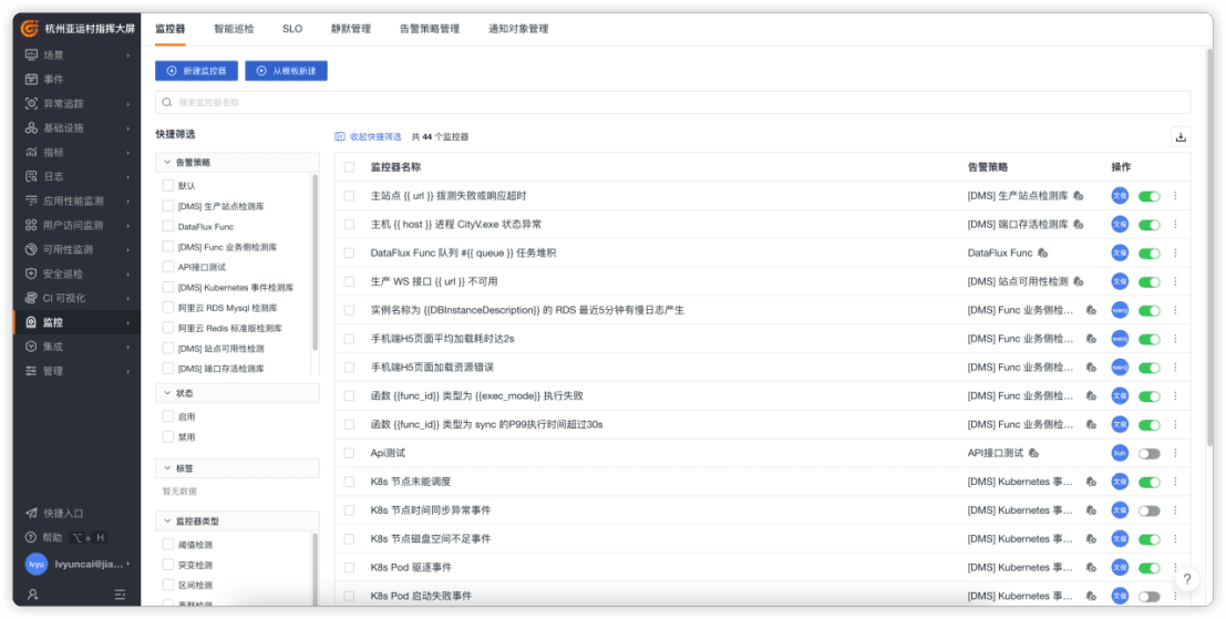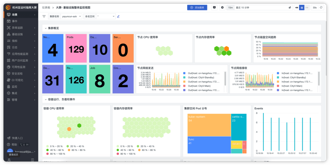 为了保障云上系统的高稳定性和高可用性,我们采用了高效的观测云技术,以实时监测系统的状态。这一系统涉及多个关键组件,其中包括专业的大屏显示和钉钉通知系统,旨在确保对系统的实时性监控和异常通知。