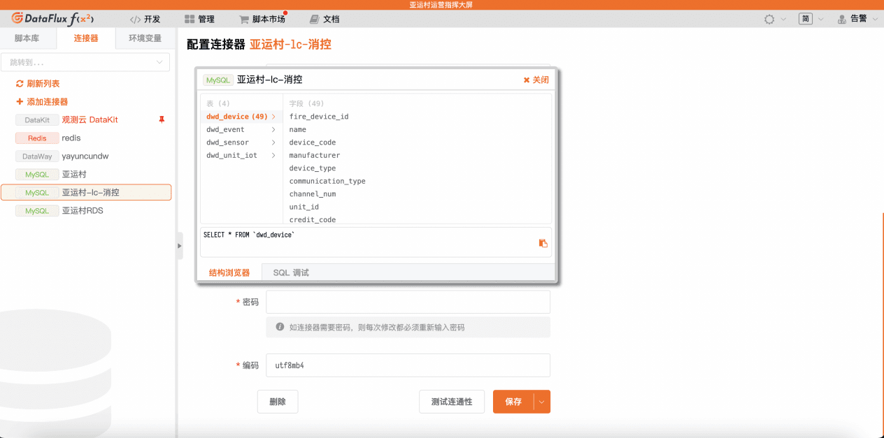 预警、c 类考勤、供水、供气、垃圾数据,f(x) 平台请求各个三方系统开放的 API 接口,获取、清洗数据并存储在数据库中,f(x) 平台兼容各种数据库的连接(mysql、redis),使用 SQL 等查询语言,查询出亚运村大屏所需指标数据并生成亚运村大屏所需数据的 API 接口。