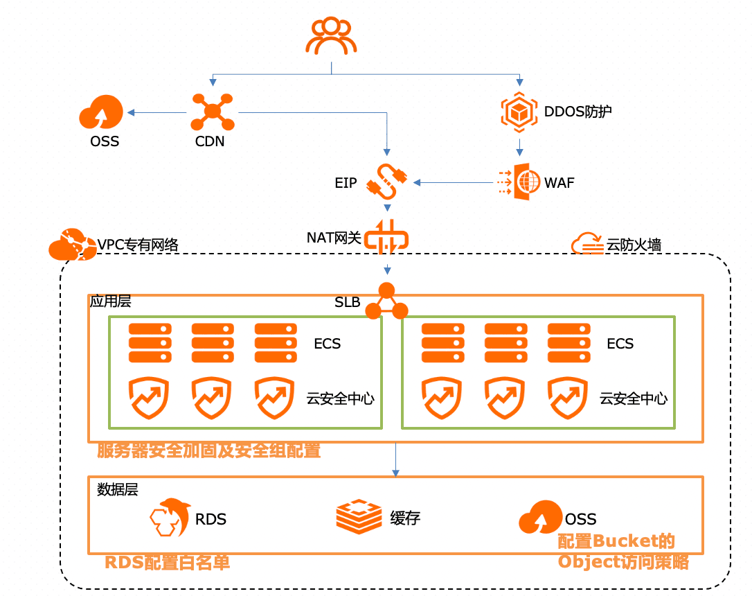 - 南北向流量通过阿里云WEB应用防火墙(7 层),云防火墙(4 层)进行管控及防护,东西向通过云防火墙进行管控及防护。