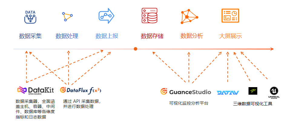 - 观测云中的监测模块采用了跨平台的数据采集引擎 DataKit,基于全栈数据的采集能力,实现了海量异构多源多样数据源的统一采集和上报,让亚运村中的基础设施、服务器硬件、应用、业务数据等做到“应采尽采”。