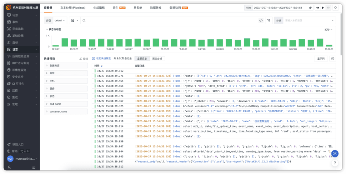 - 同时观测云平台会实时生成一个统一的界面,全环境高基数采集数据,支持多维度信息智能检索分析,用可观测性对亚运村 VOC 平台数据的全生命周期进行管理。