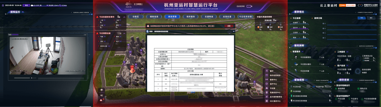 VOC 平台历时 9 个月的开发,并于 2023 年 9 月 8 日上线。平台采用阿里云数据仓库、数据治理、数据挖掘与量化决策分析等技术,打破系统壁垒,完成与云上通预约系统、亚运钉考勤系统、亚组委赛事管理系统等 20+ 个系统的对接工作、确定了约 440 个数据指标,融合了村内人、物、场、安全、服务、低碳 6 大领域实时运营数据,为包括指挥长在内的管理人员提供实时数据和智能决策支持。