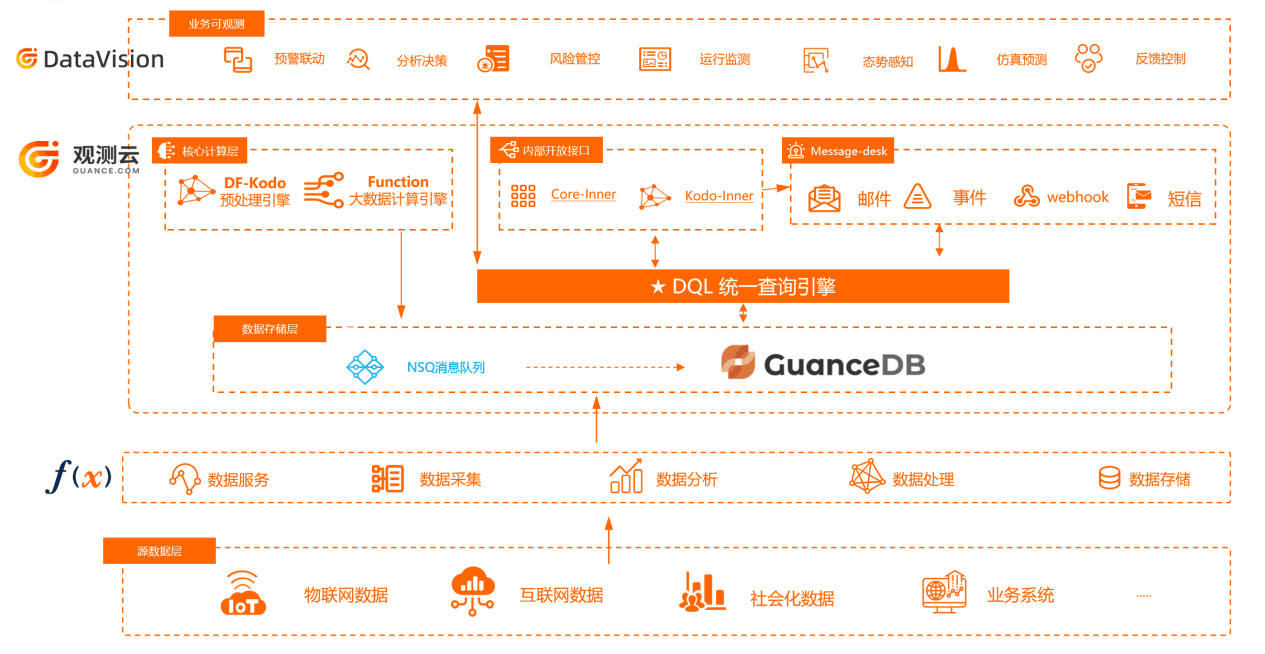 - 亚运村的数据采集完成后,数据通过预处理引擎 DF-Kodo 写入消息队列,对多类型的数据进行统一查询,底层采用了多模数据湖形态,将亚运村的日志,对象,链路,事件等数据结构进行了统一的存储,通过行协议(Line Protocol)经过统一的 Dataway 接口实现一致性高效低延时的写入自主研发的时序数据库 GuanceDB,由自研的查询语言 DQL 进行统一的查询与分析。