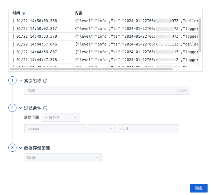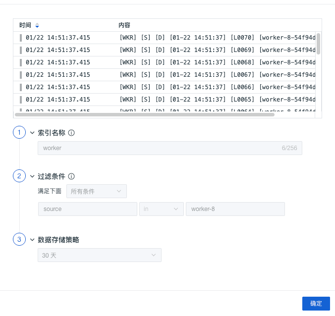 我们需要快速检索 source 为 worker-8 以及 source 为 etcd 的日志数据以快速定位相关关键日志信息,从而更好发现并解决系统的问题。因此我们创建两个名为 woker 和 rp60 的日志索引,并分设置了数据存储时间以便合理控制存储费用。