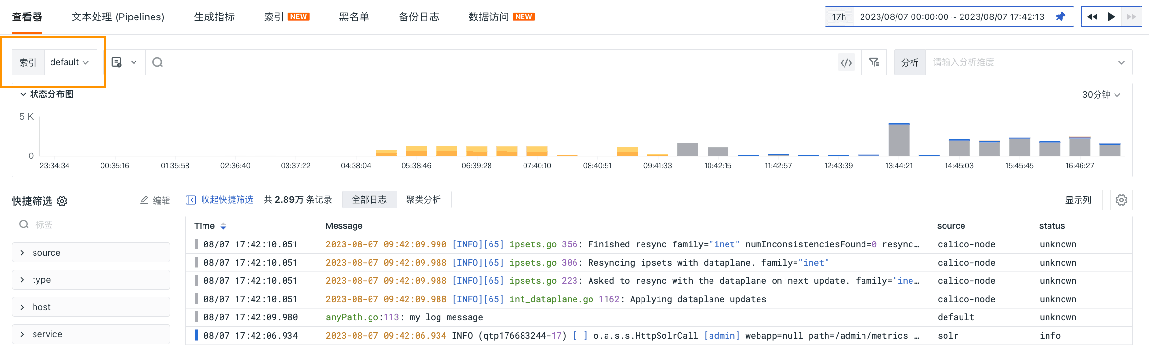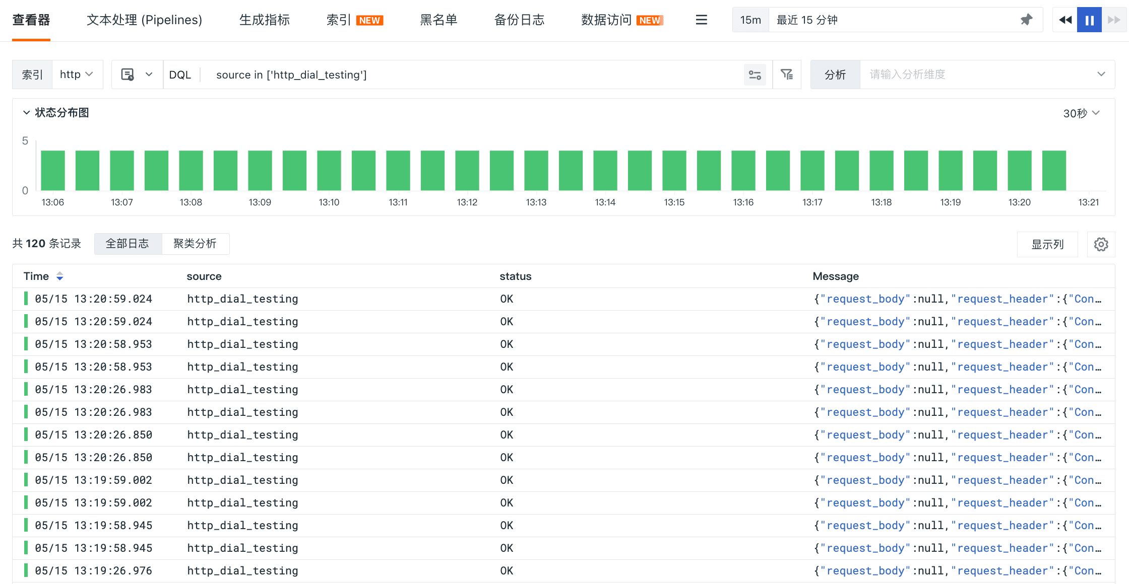 当您创建完一个日志索引后,您可以直接在列表中点击查看该日志索引中的日志数据,同时,您还能够在日志查看器直接切换不同索引并继续下钻分析日志详情,提高发现、分析、解决问题的效率。下图以配置过滤条件为 source 是 http_dial_testing 的日志索引为例: