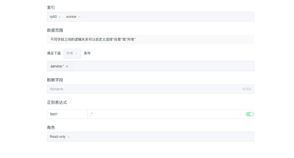 这样我们就能够直接快速查看和分析 woker 和 rp60 的日志数据(如上图所示)。除此以外,为了不泄漏敏感敏感信息的同时能够与团队成员进行数据共享,我们需要对这两个日志索引进行数据访问权限的设置。我们设置该规则为:两个索引中全部 service 相关数据中的 filename 字段都将根据 test1 正则表达式脱敏后展示给 Read-only 的角色成员。至此,我们便完成了利用日志多索引和数据访问规则,实现合理控制日志数据资源的访问范围以及后续高效分析问题的基础。