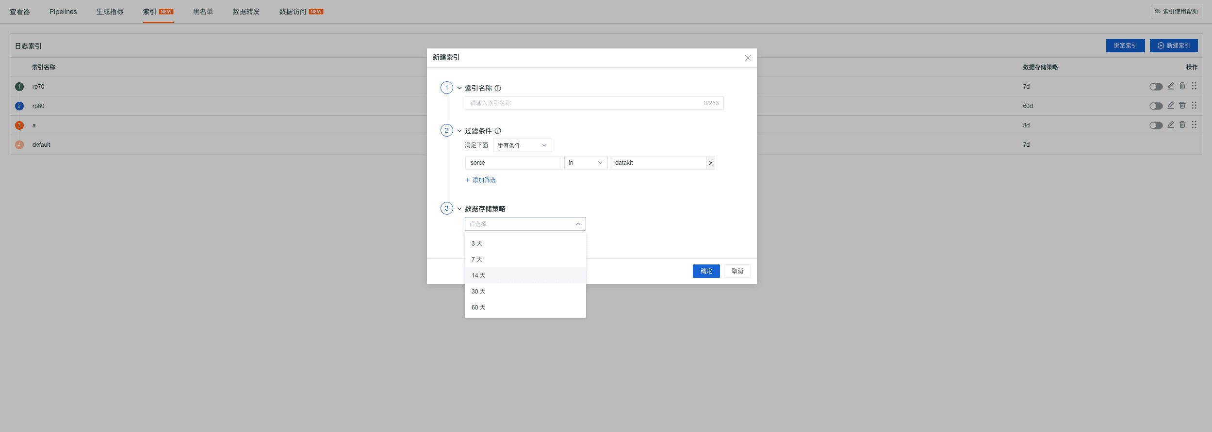 如上图所示,您可以在新建索引页面,输入索引名称(必须唯一),设置所需要的过滤条件,最后为该索引的数据选择存储策略(支持 7 天、14 天、30 天 和 60 天),合理分配存储成本。