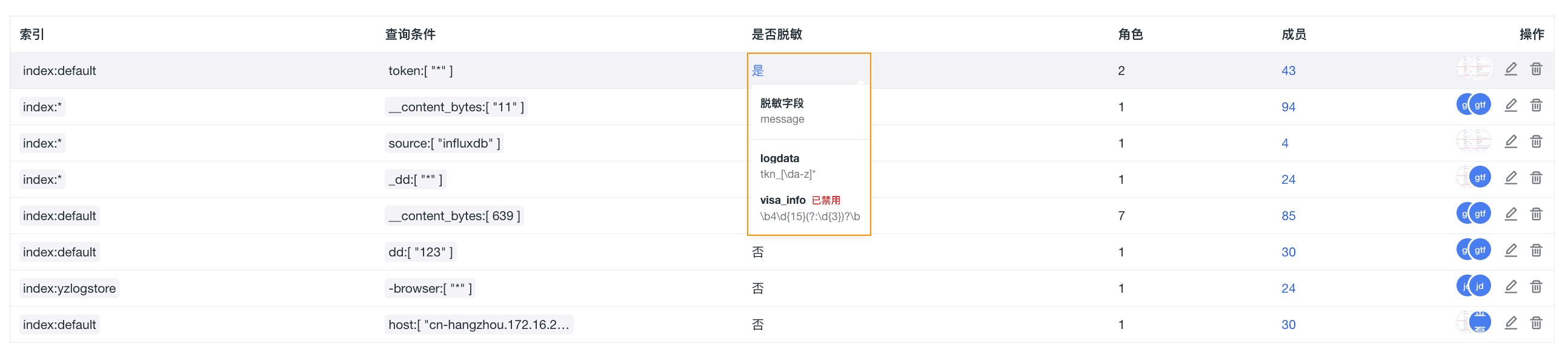 最后,完成以上数据访问规则的创建后,你就可以在列表中查看该规则是否脱敏以及关联的角色数量与角色对应成员数量,更加清晰的展示相关的信息,帮助您高效管理日志数据的相关访问权限。