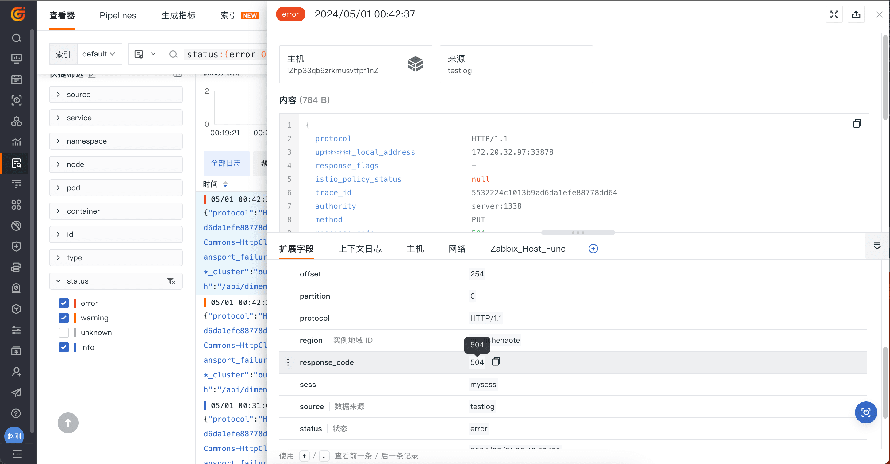 下图 protocol、response_code 以及 time 都是使用 Pipeline 提取后的效果。