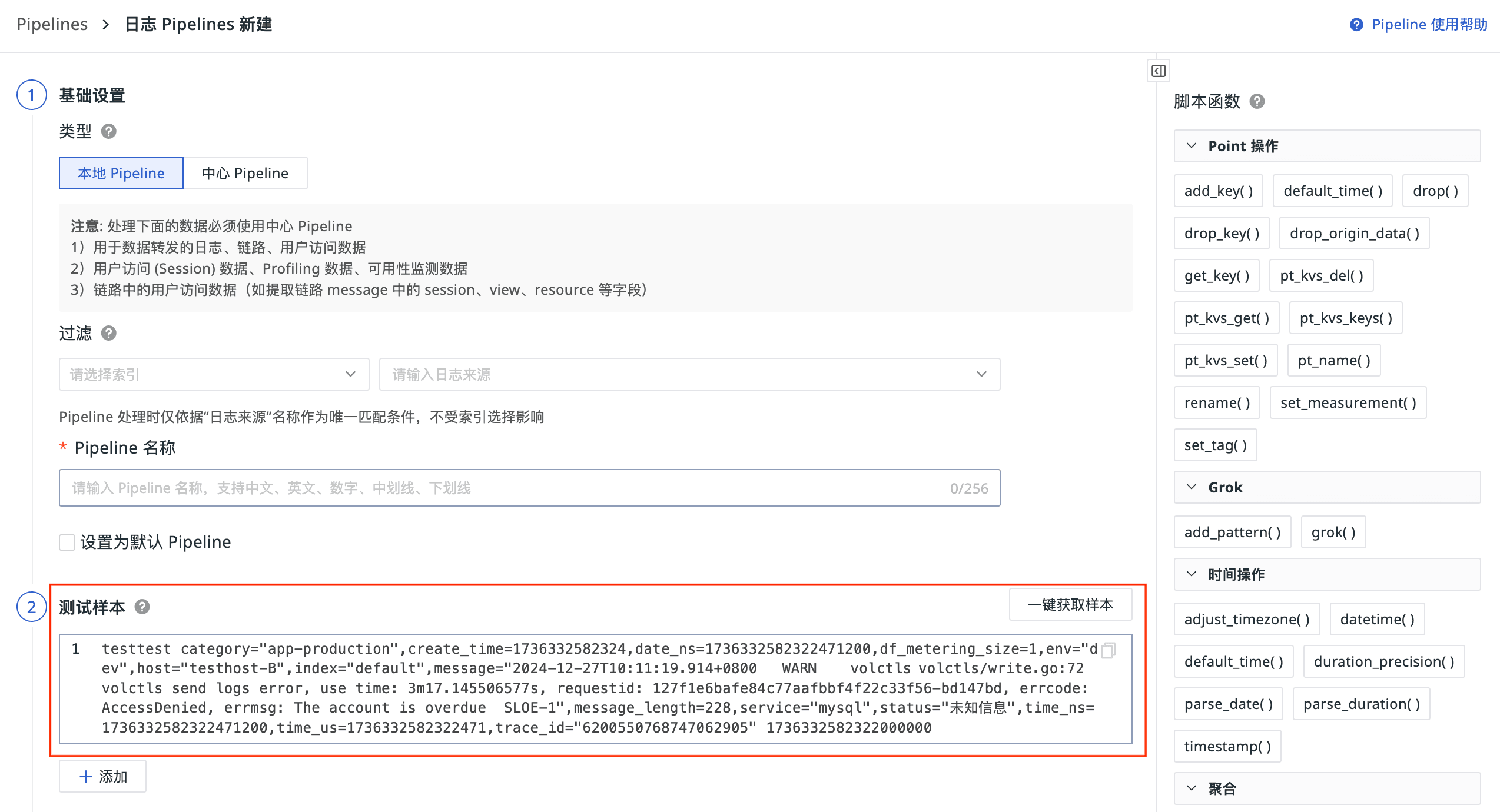 3、日志 Pipeline 优化:日志 Pipeline 的测试样本调整为获取日志的全部字段,并且需要以行协议格式填入。同时用户手动输入的日志也要遵循格式要求。