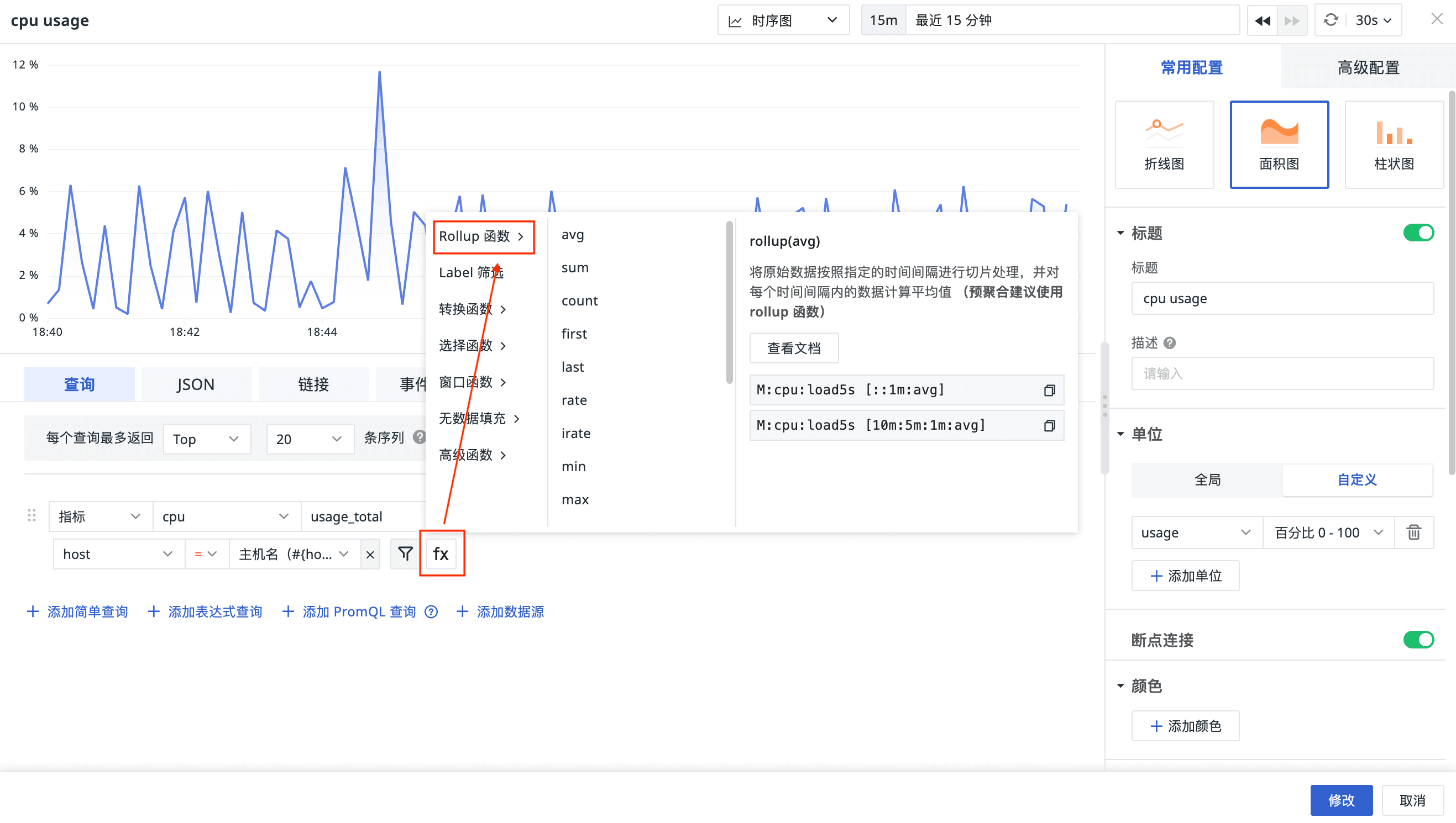 3、图表优化:调整了 DQL 查询组件的函数顺序,同时特别强调了 Rollup 函数的使用场景,帮助用户更好地利用 Rollup 函数进行数据聚合和分析。