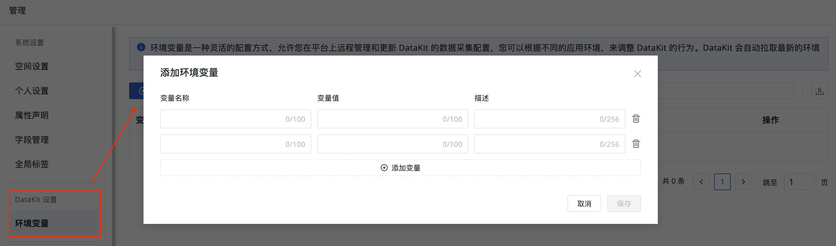 2、工作空间新增 DataKit 环境变量:工作空间支持管理 DataKit 环境变量,用户可以轻松配置和更新环境变量,实现远程同步更新 DataKit 采集配置。
