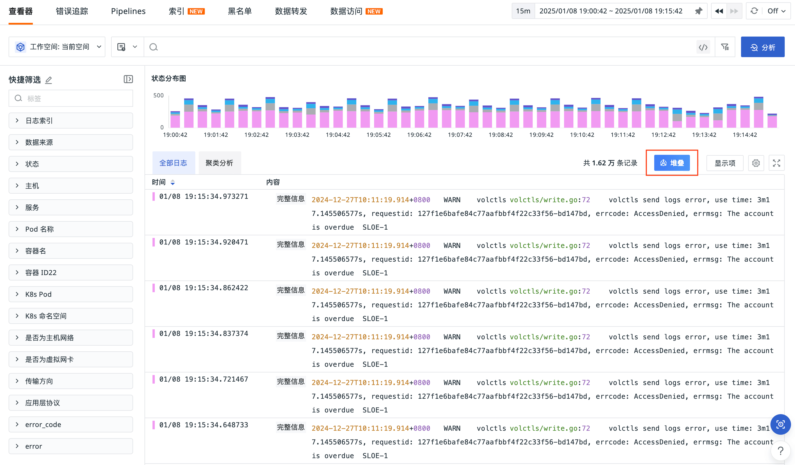 2、日志查看器新增堆叠查看模式:堆叠模式下字段将会整合在同一列, 并且这些字段在单元格内部以行的形式呈现。日志信息的展示更加紧凑和清晰,方便用户快速浏览和分析。