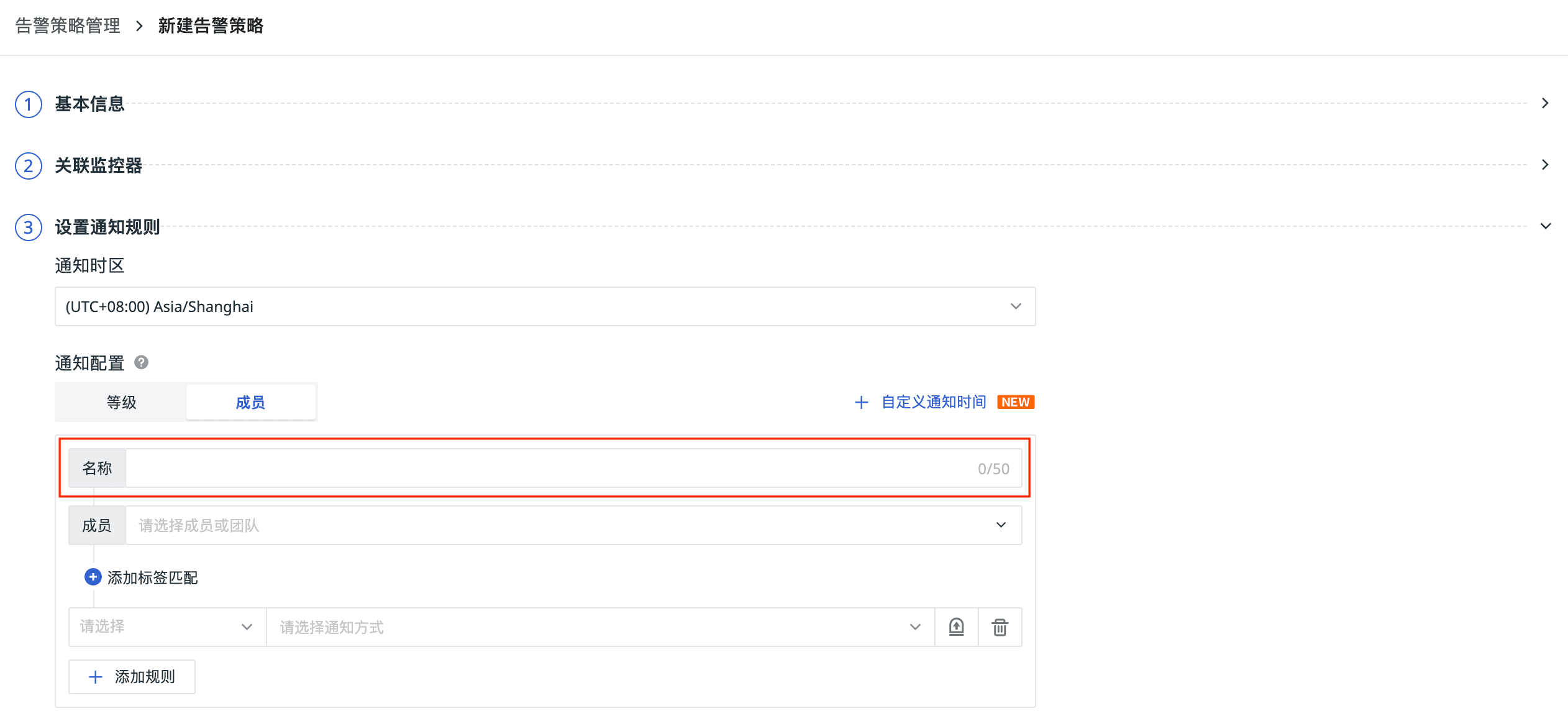 告警策略:按照成员配置通知规则支持追加名称用于用途描述。