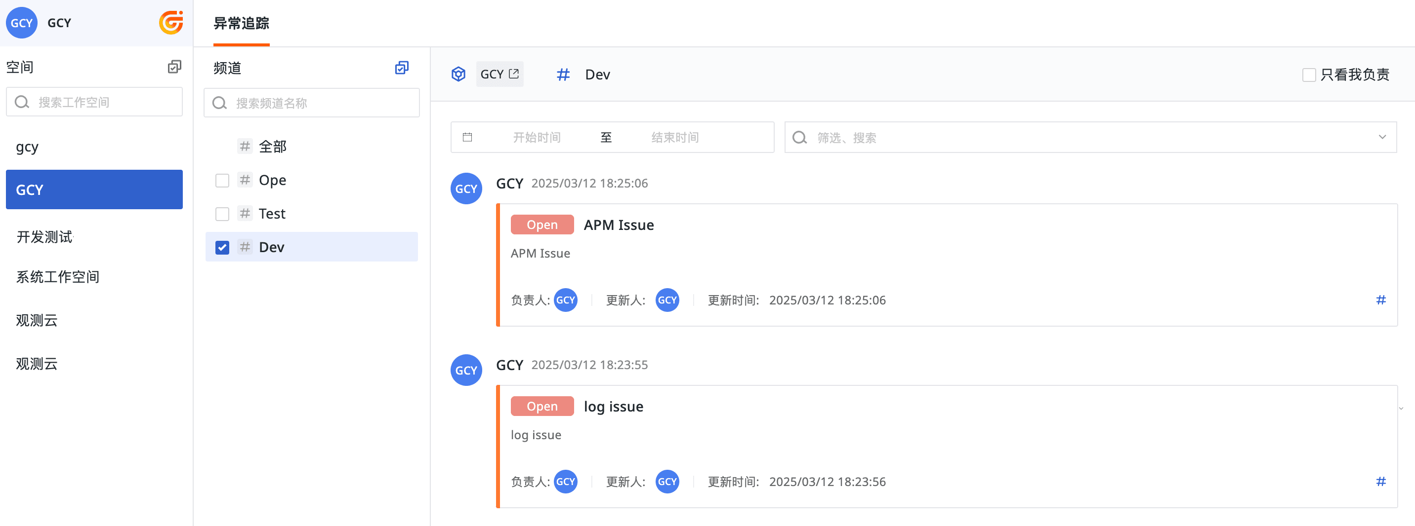 1、新增异常追踪管理入口,通过该入口,当前登录用户可以查看和管理所有已加入工作空间的异常追踪状态。