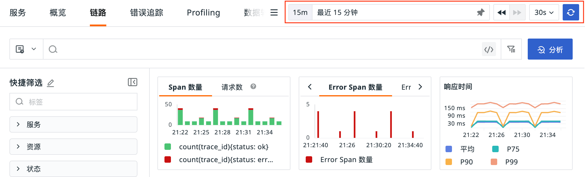 左侧选择时间范围与右侧刷新频率各自独立。仅两种情况会影响刷新频率: