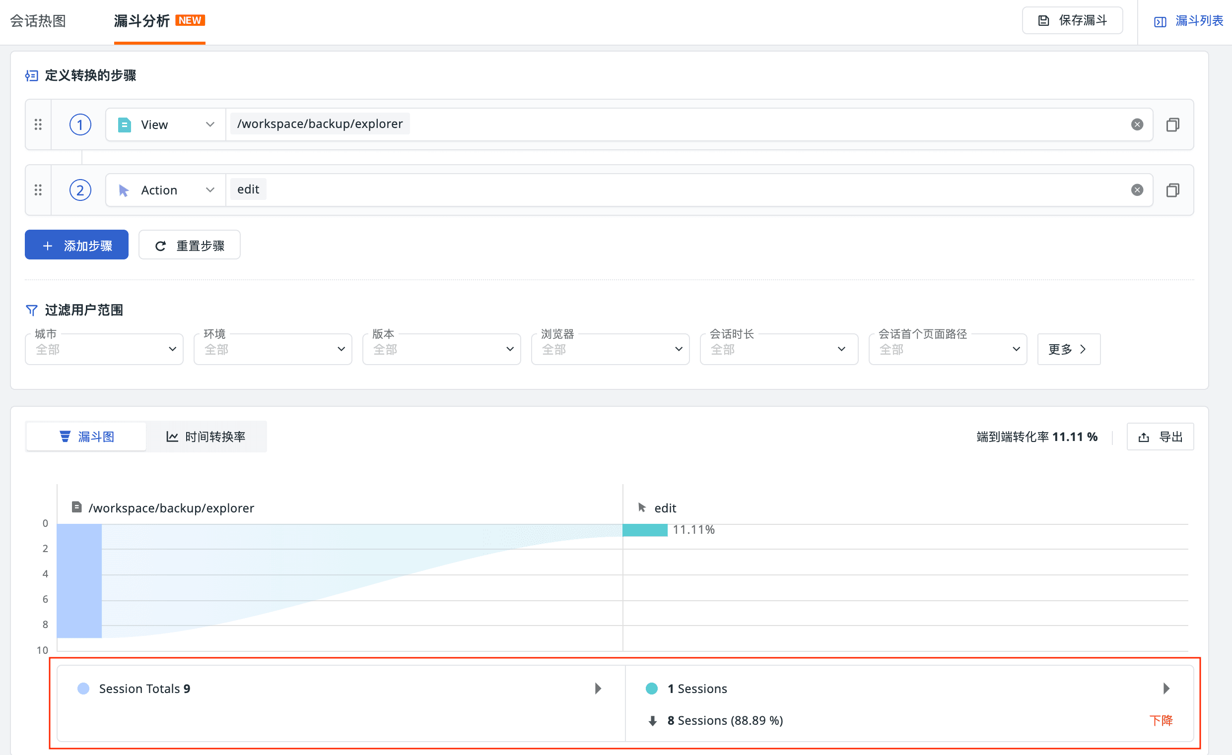 用户洞察 > 漏斗分析:对于查询到的 Session 列表支持会话重放功能。