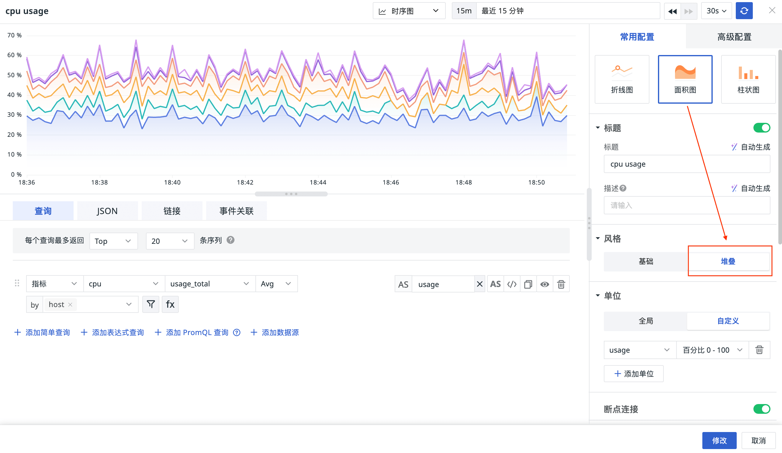 2、时序图:选择面积图作为图表类型后,新增堆叠模式风格,便于观察整体数据的累积效果。