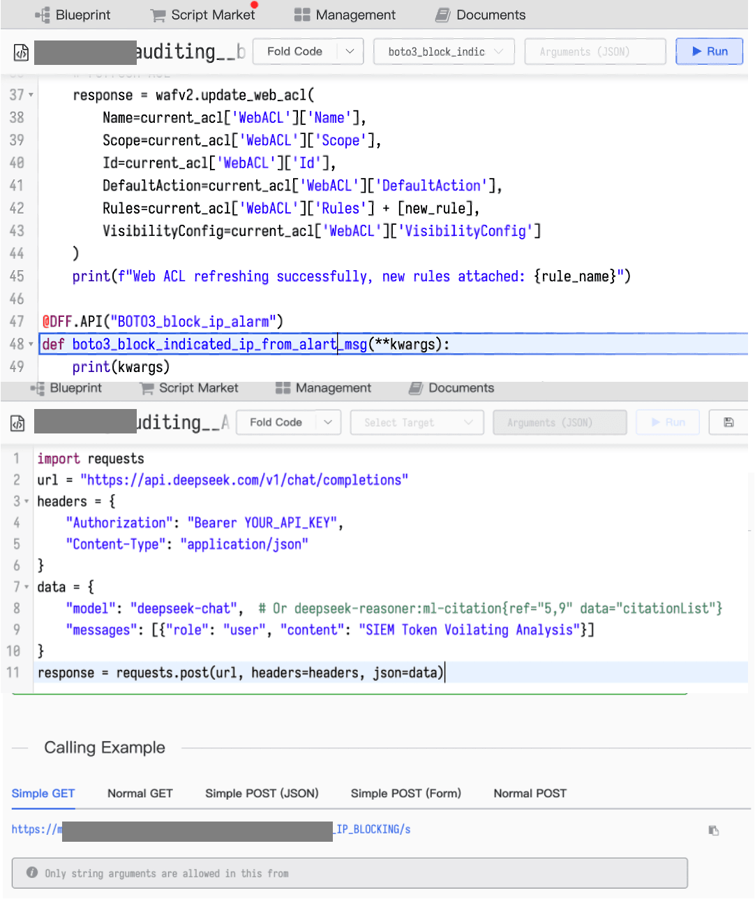 同时,用户可以通过在自定义 webhook 通道中配置 DataFlux Func 用户自定义函数的访问地址,结合 UDF 执行逻辑实现 SOAR 效果,以威胁检测信号为输入,为特定安全目标进行自动化配置操作以及时解除安全威胁。或将 SIEM 检测与 AI 大模型结合,将检测数据通过UDF通知发送至推理大模型,基于AI能力实现更精准的动态威胁检测效果。