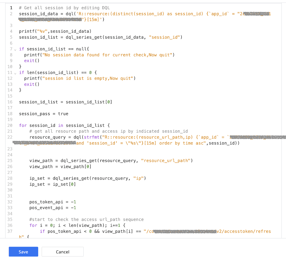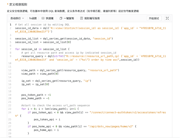 查询到对应会话后,针对会话内所有 resource 类型的访问 uri 进行聚合 DQL 查询,获取每个 session 的所有 uri 列表。并按照预设的 uri 顺序检查列表中的 uri 是否满足特定访问顺序,例如必须定时进行 token/refresh 操作,对用户 token 进行更新。或 token 刷新操作的顺序必须先于某个特定页面的访问。这个操作需要借助 SIEM 规则引擎的条件分支及数据处理判断能力,代码示例如下: