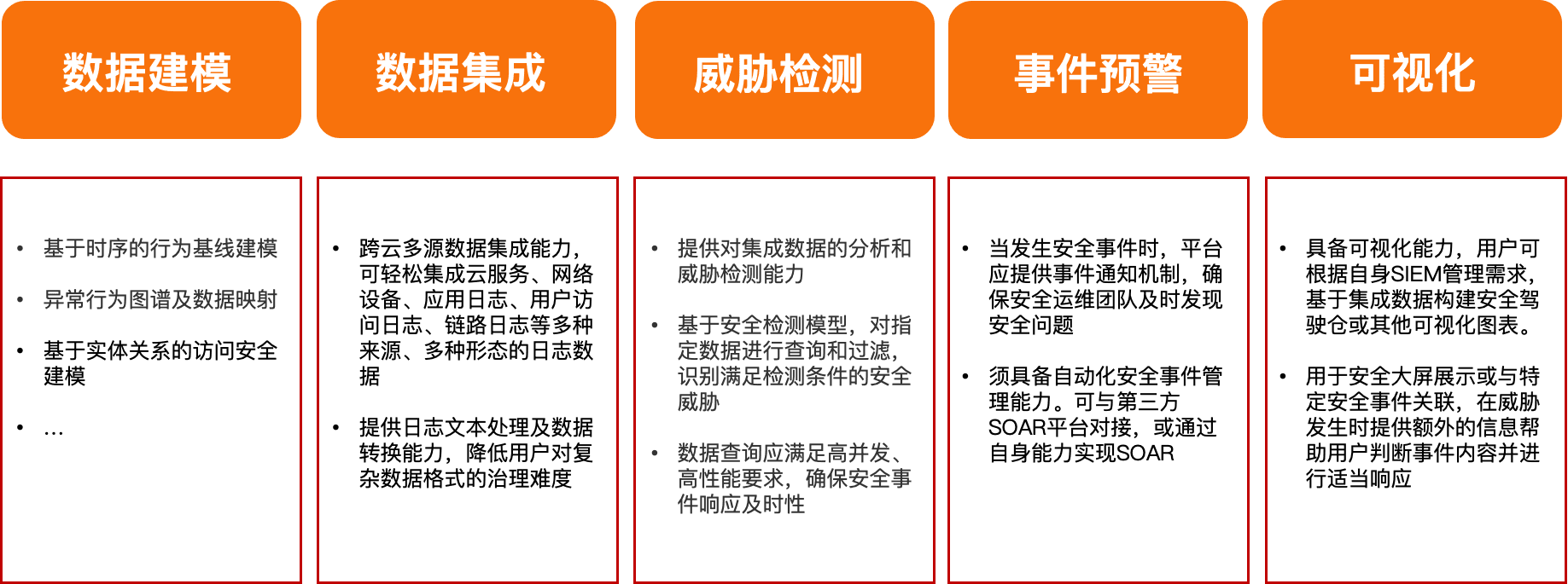 SIEM 项目能否成功落地,一款合适的工具所提供的支持至关重要。工具的作用域主要集中在以下几个维度:数据建模、数据集成、威胁检测、事件预警和数据可视化。
