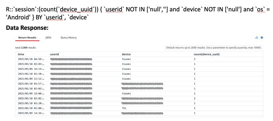 用户审计团队识别非法访问的判断逻辑可简化描述为:一段时间内特定用户的特定会话,是否存在缺少 token 更新操作,使用过期 token 或直接绕过 token 访问了特定 uri 资源。为找到符合这个特征的用户,审计团队首先通过 DQL 语言对指定时间窗内的所有用户会话进行筛选。