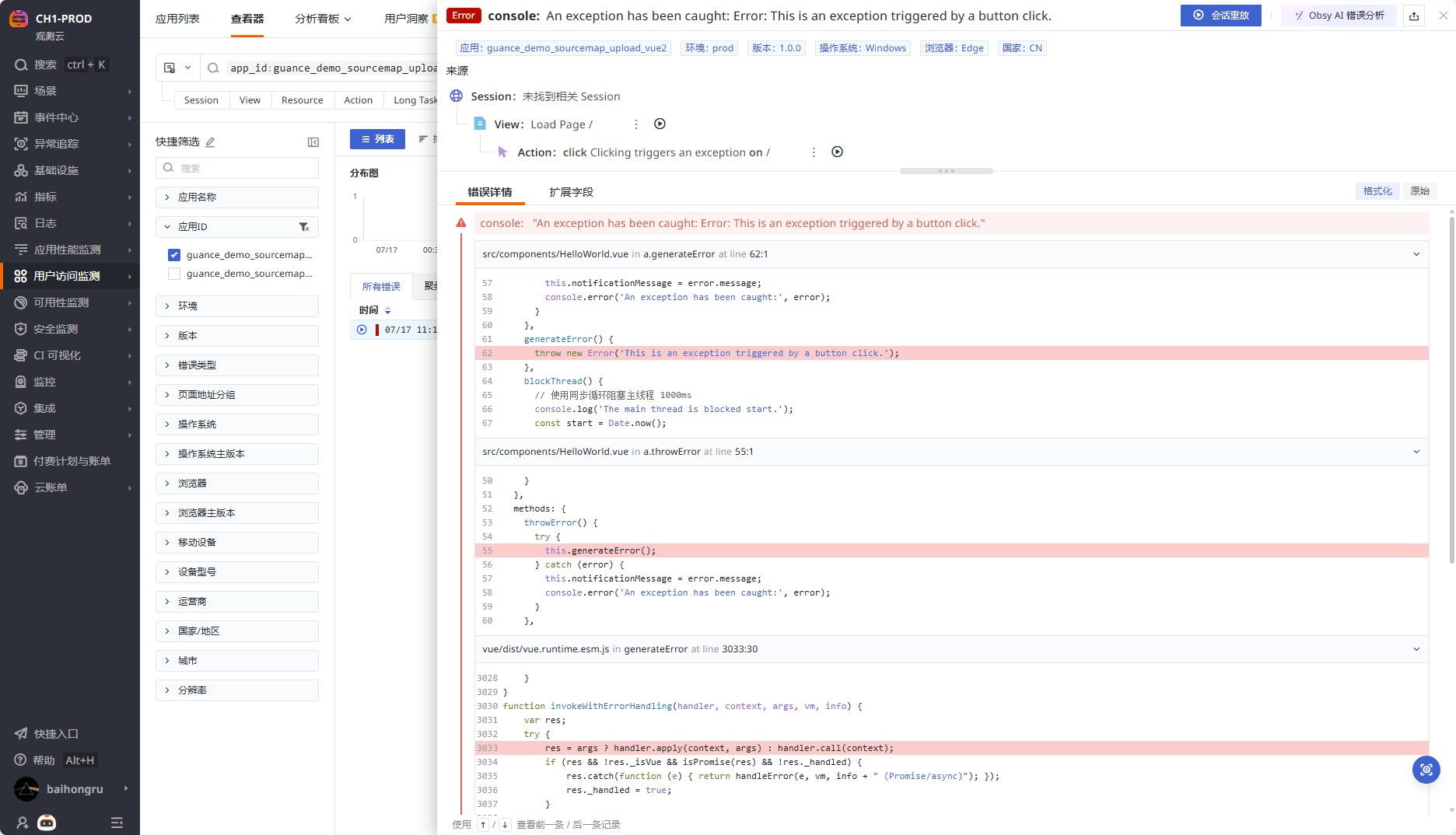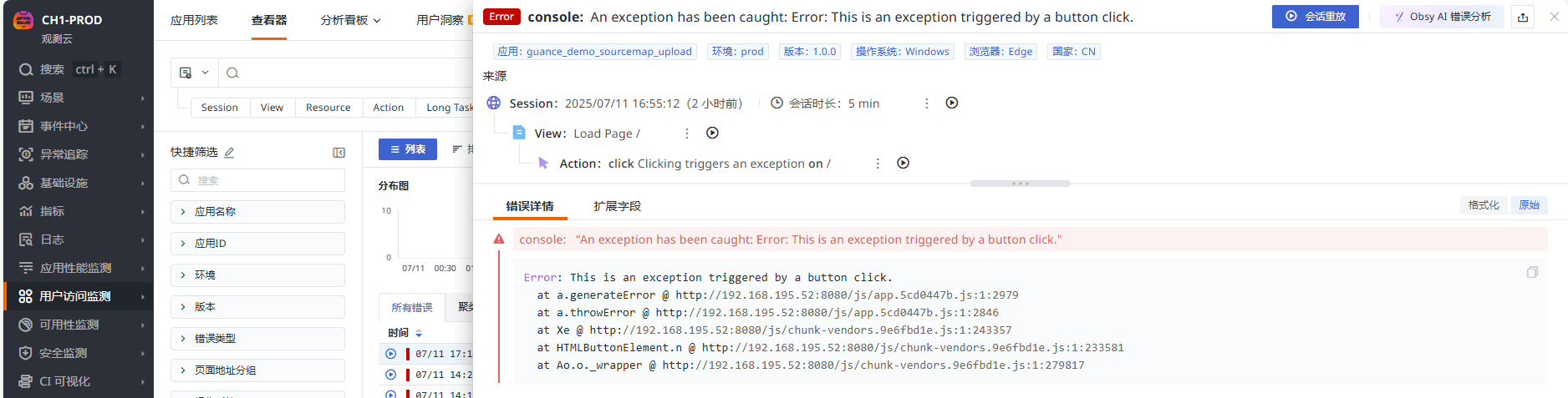 再次访问页面触发错误,稍等片刻查看捕获到的错误详情,即可看到映射后的原始代码,这与为应用添加场景时的代码一致: