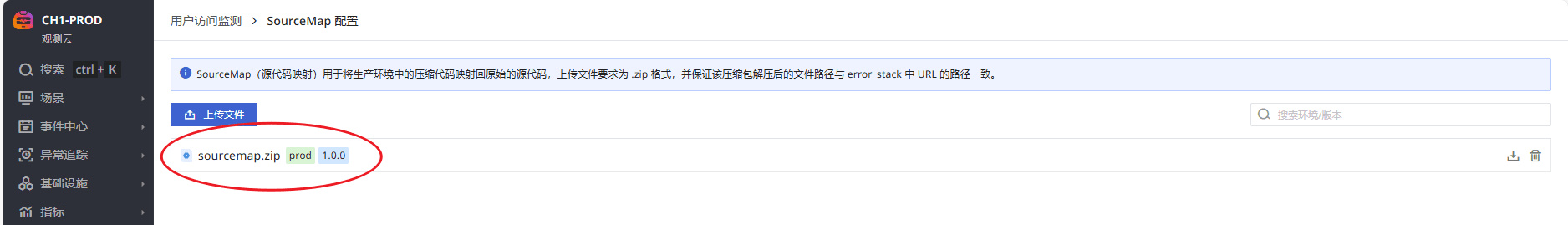 执行构建后可在观测云界面看到上传成功的 sourcemap.zip: