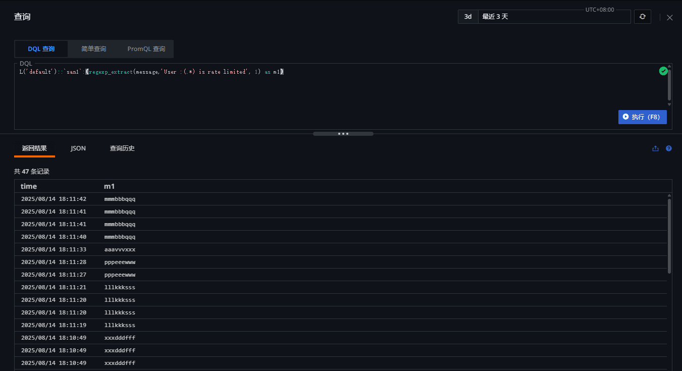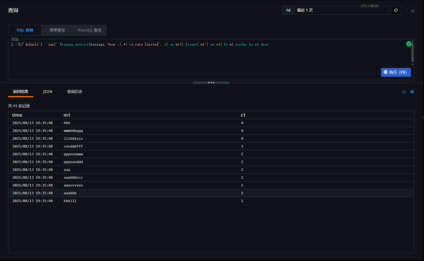 查询返回的结果如下(m1列就是日志原文中提取出来的 uesrid):