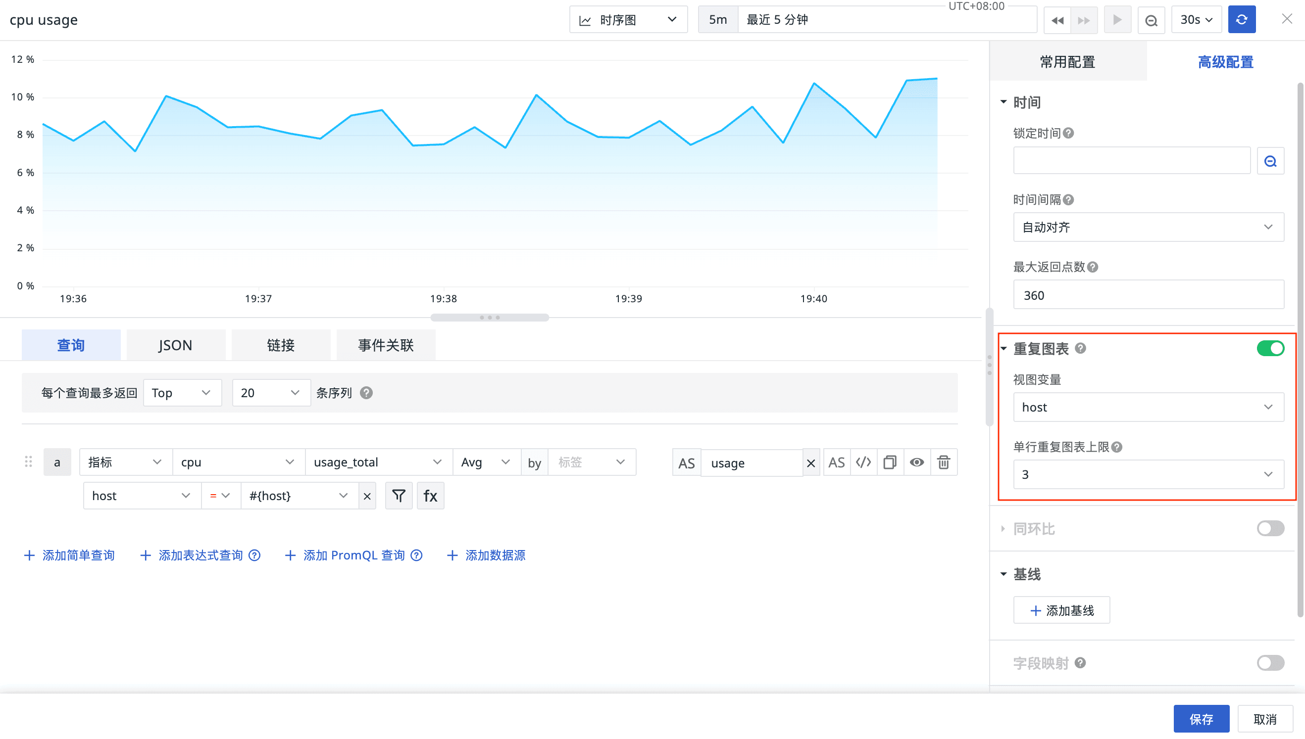 - 高级配置:新增“重复图表”选项。开启后,系统会根据所选视图变量的各个值,按相同结构生成多张图表;