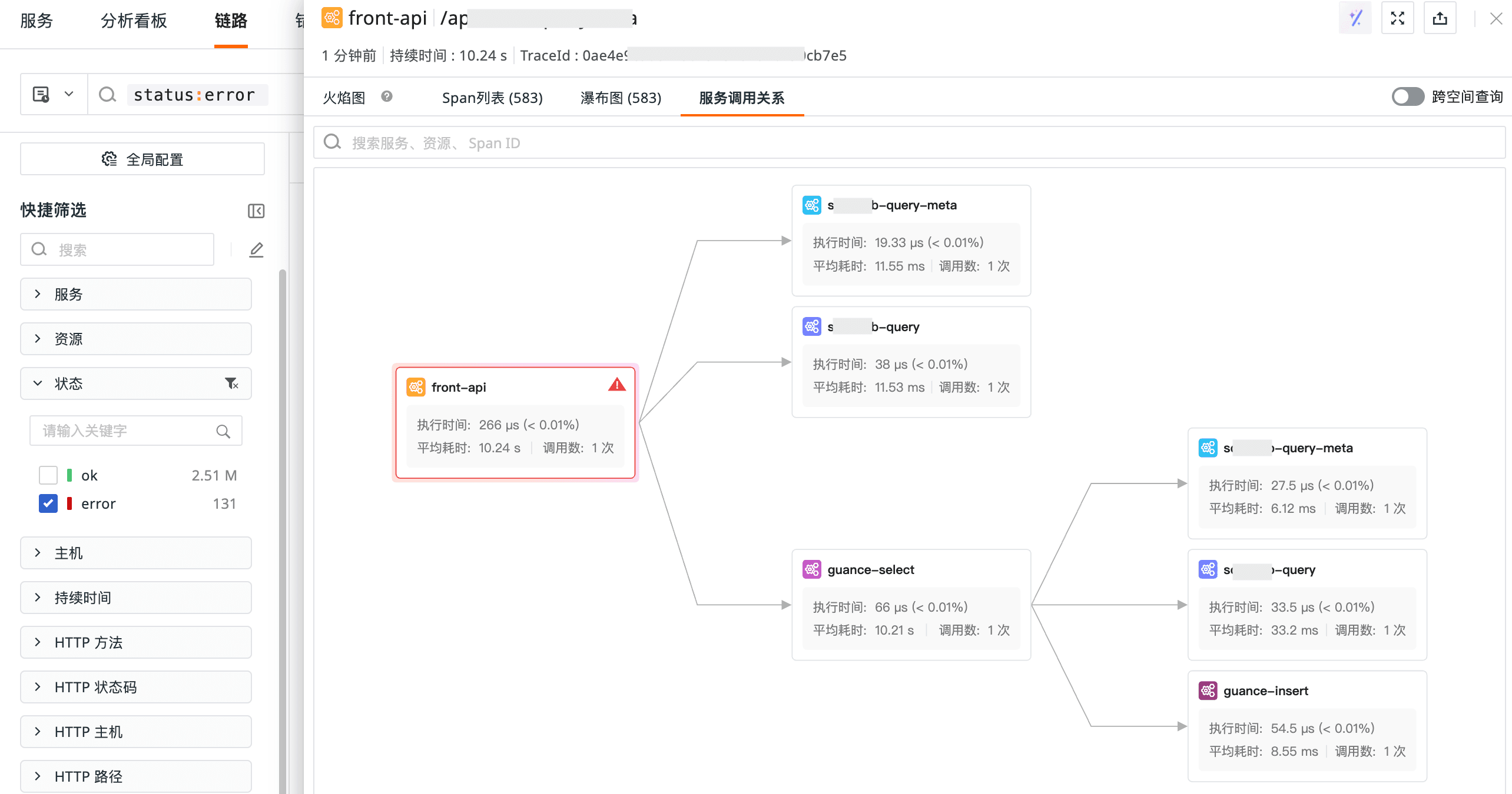 - 节点信息增强:通过左右结构展示全路径服务调用关系,同时在每个服务节点上,直接展示执行时间、平均响应时间、调用次数、错误信息;点击可查看服的父级 Span,用于追溯上游调用来源;若该服务存在错误,将直接展示错误详情。