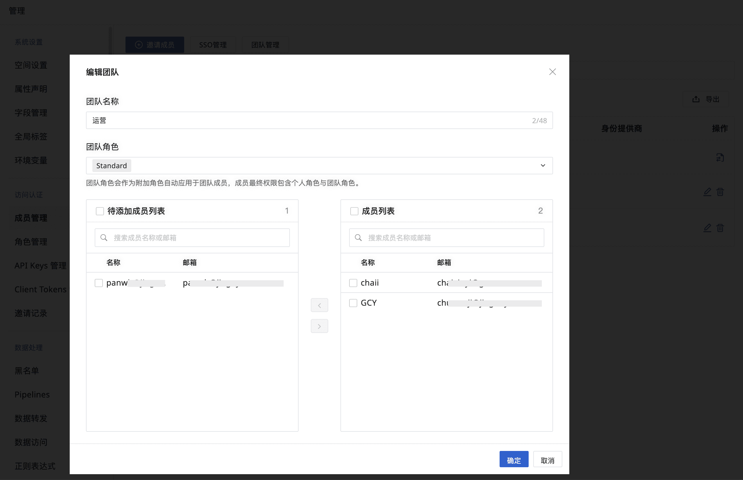 2、成员管理:支持为团队赋予角色。团队角色会作为附加角色自动应用于团队成员,成员最终权限包含个人角色与团队角色。