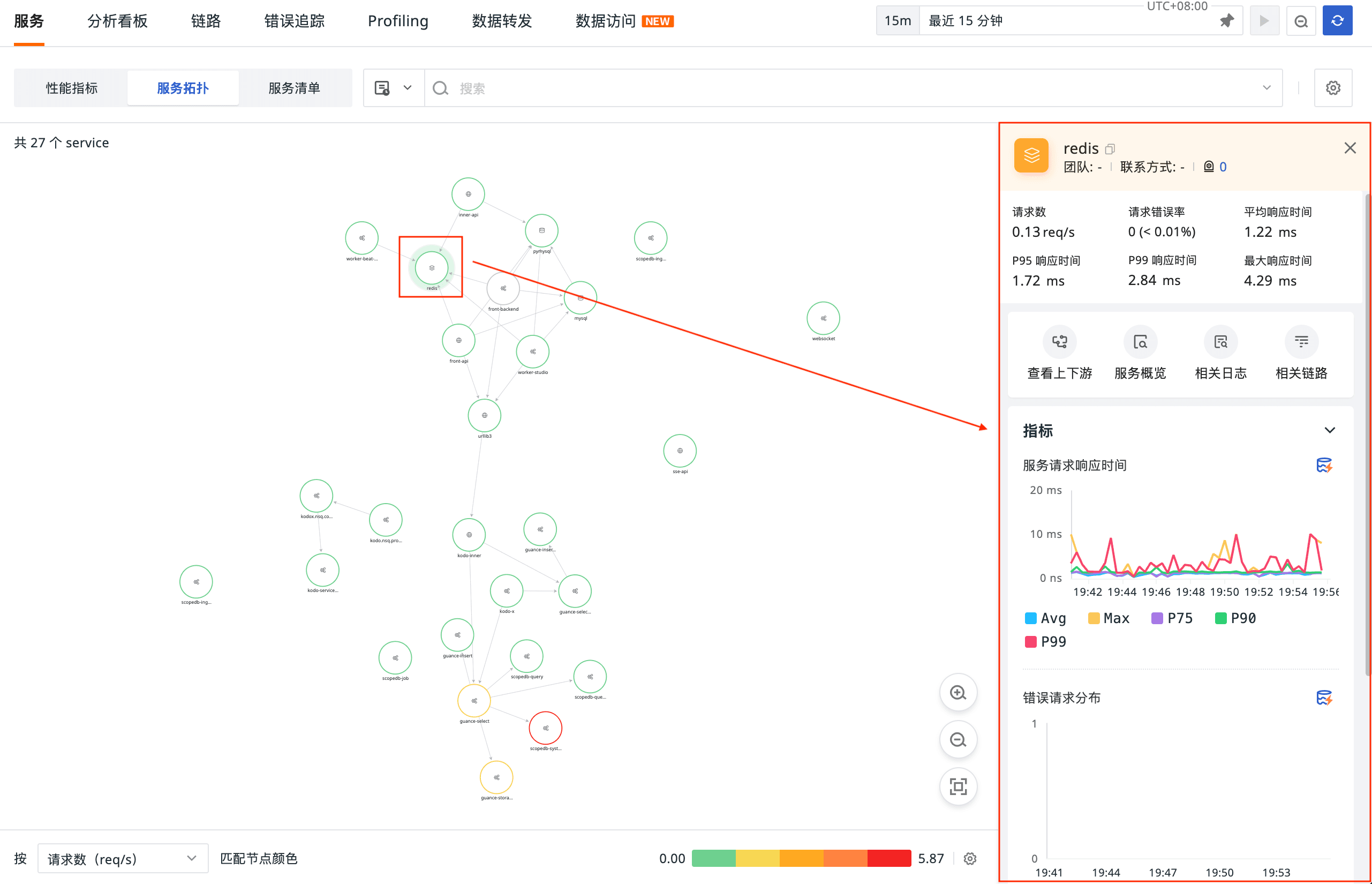 - 点击节点,新增右侧划对应服务详情,除服务名称、对应团队、联系方式、告警数量、基础指标数据外,展示指标(服务请求响应时间、错误请求分布)和日志(错误日志数)的异常趋势图;