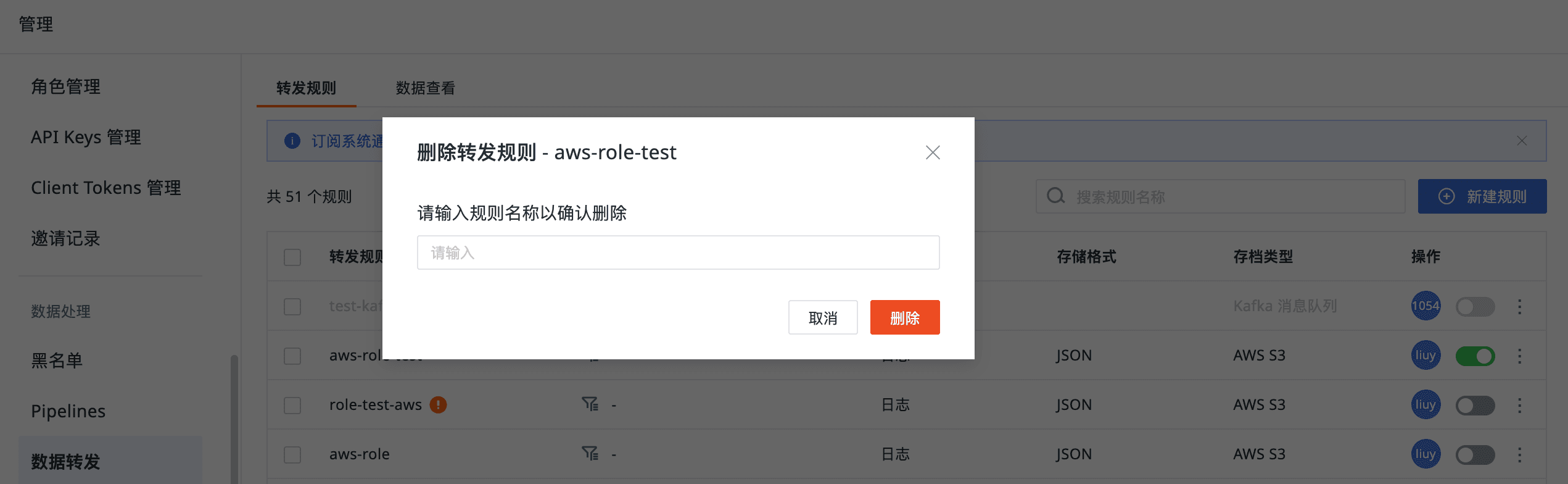 1、数据转发:删除规则时,需输入规则名称以确认操作;