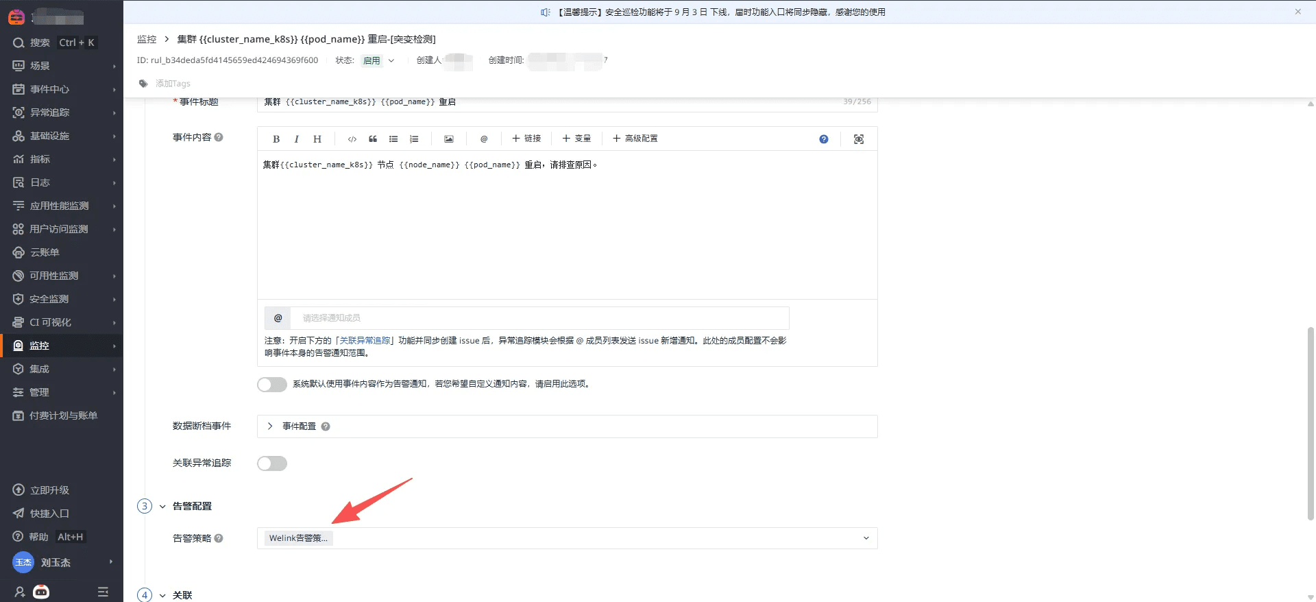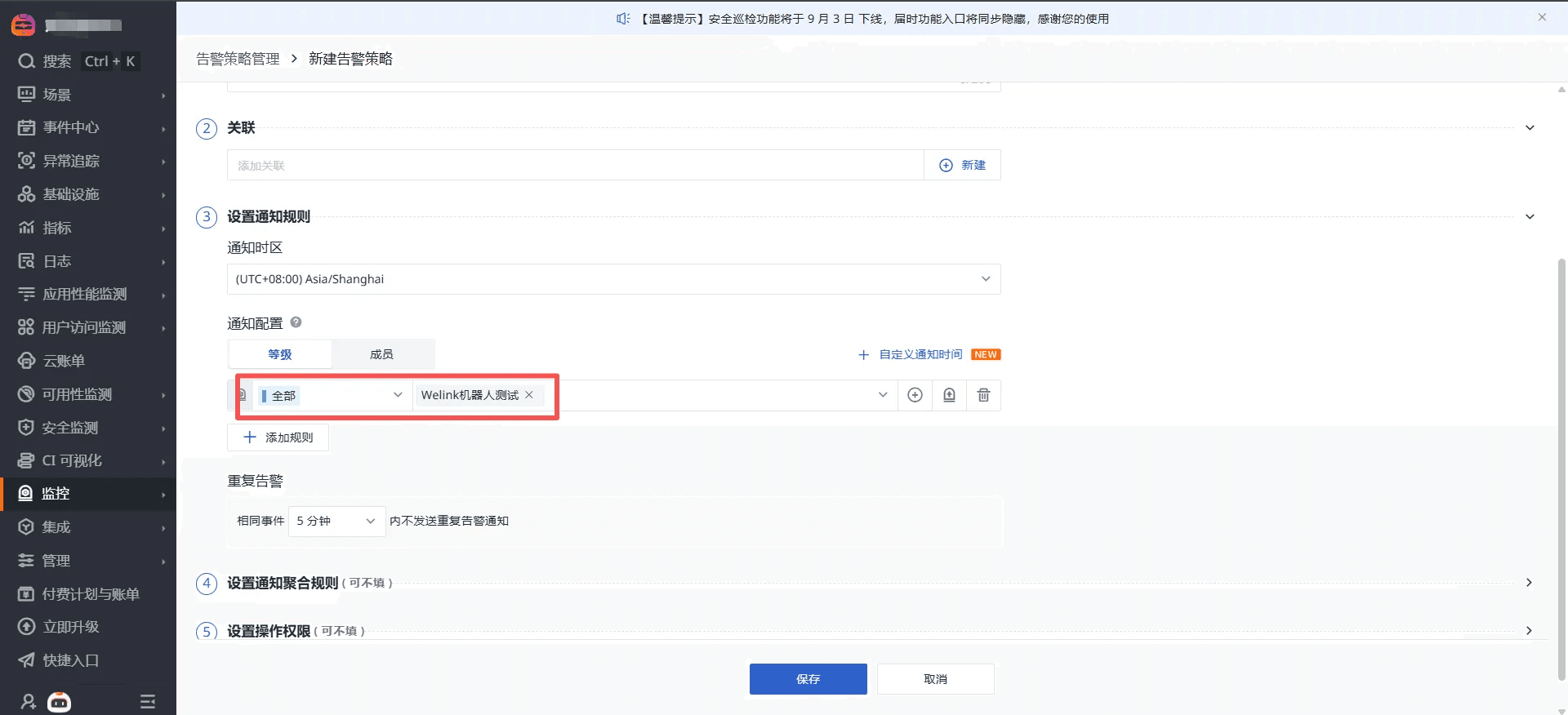 进入“监控”->“告警策略管理”->“新建告警策略”,通知配置中按下图配置,最后点击“保存”。