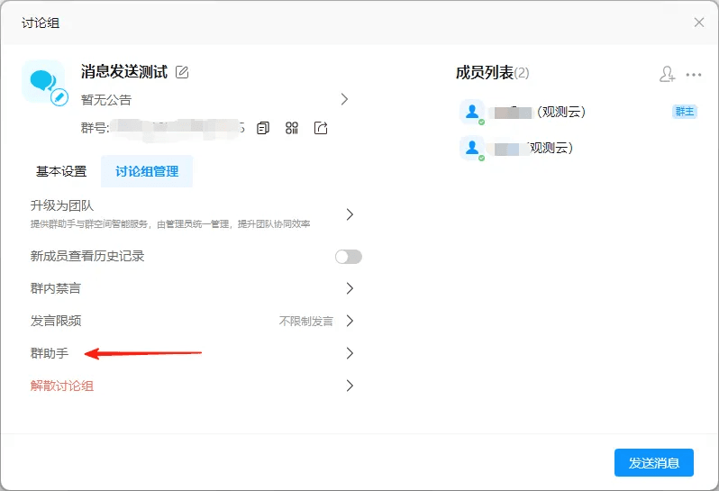 点击群右上角的齿轮图表,弹出讨论组,在“讨论组管理”下面点击“群助手”。