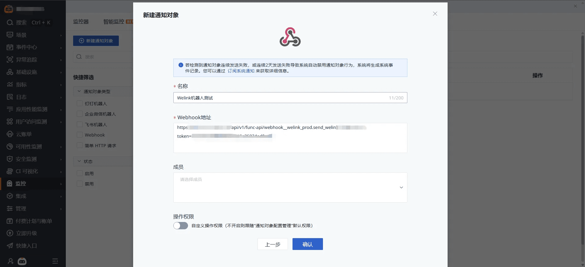 登录观测云,进入“监控”->“通知对象管理”->“新建通知对象”,选择“webhook”,Webhook地址中粘贴上步复制的 url,最后点击“确认”。