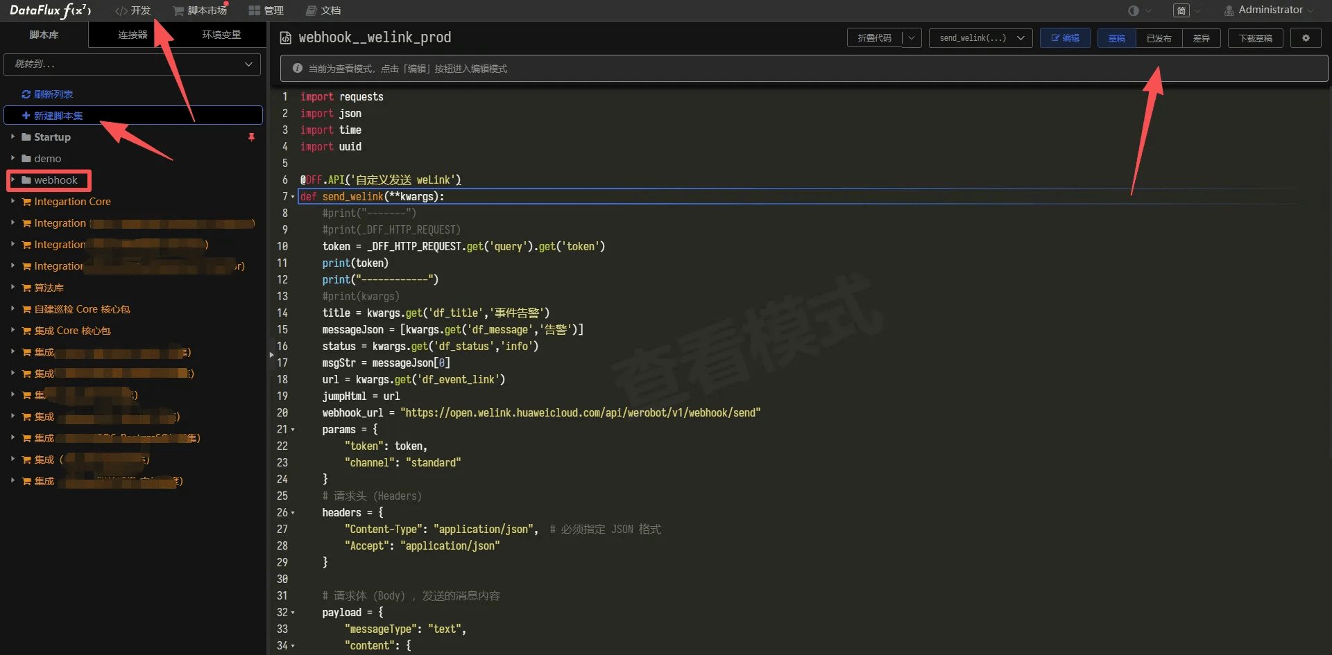 登录 Func,点击“开发”->“脚本库”->“新建脚本集”,输入 “webhook”,鼠标移到 webhook 上,点击“新建脚本”,输入“welink_prod”,编辑脚本,输入如下内容,最后点击“发布”。