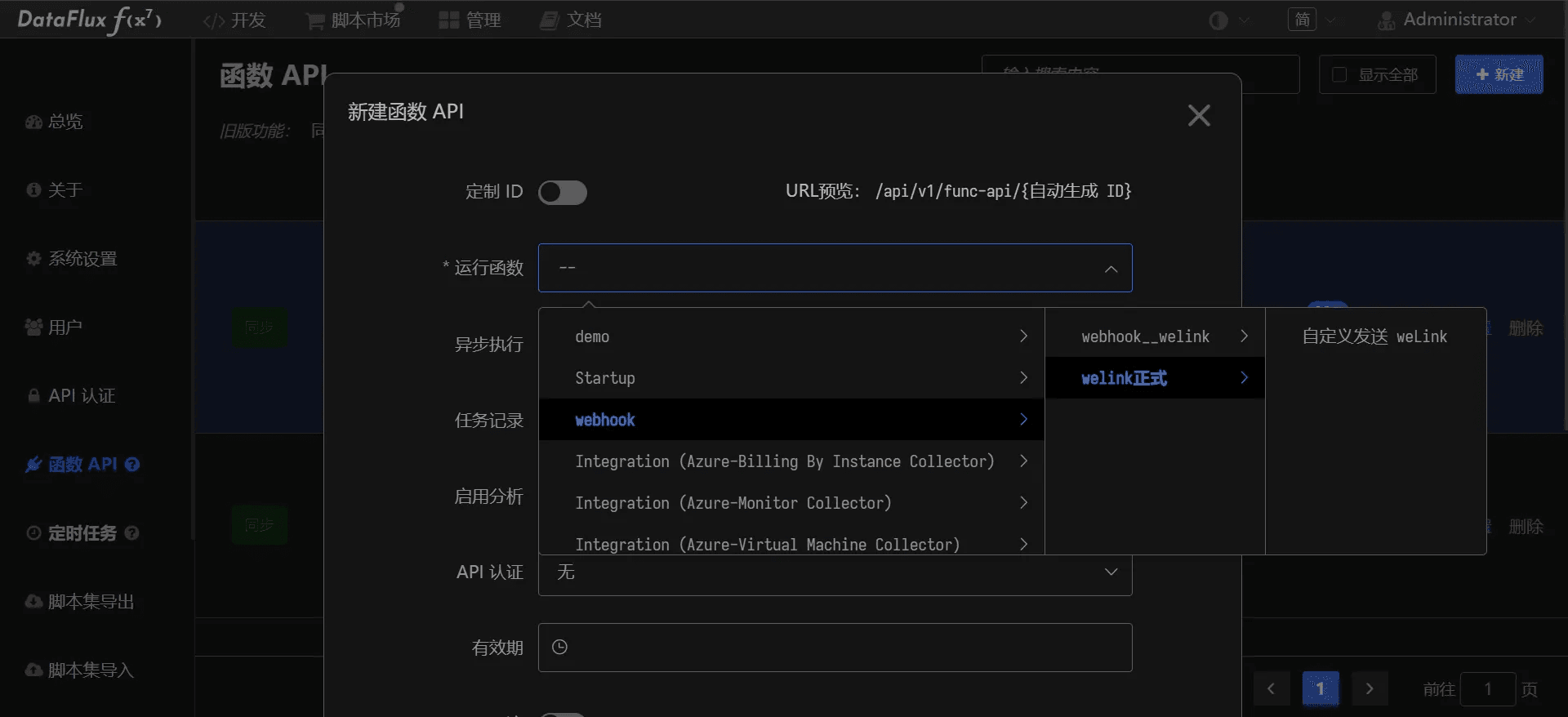 依次进入 Func 界面的“管理”->“函数 API”,点击“新建”,运行函数选择上步编写的脚本,点击“保存”。