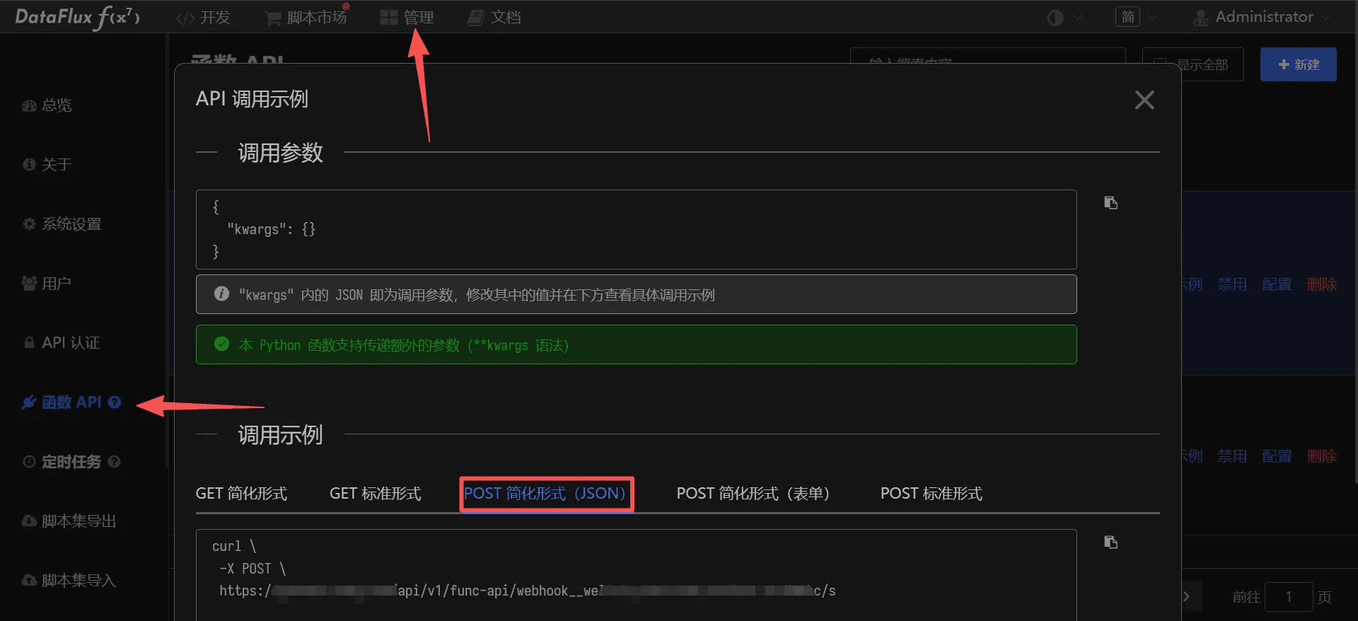 在函数 API 界面,刚创建的函数行后面有个“示例”,点击后,复制“POST简化形式(JSON)”里面的 url。