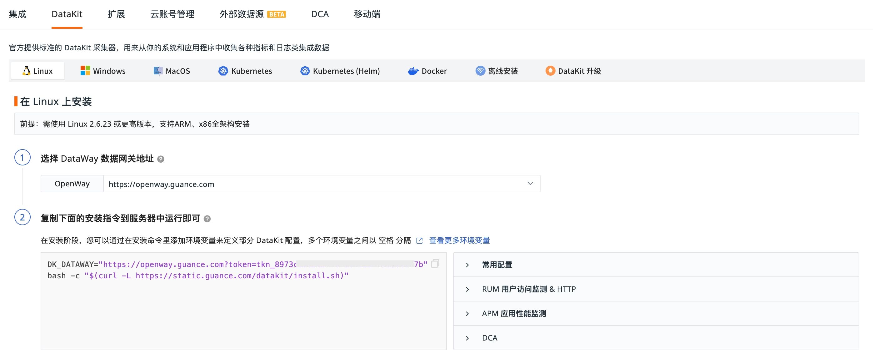 进入观测云控制台 -「集成」-「DataKit」-「Linux」复制命令安装 DataKit 。