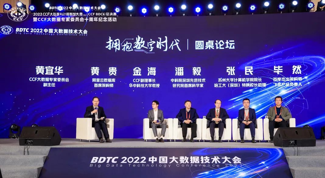 在“拥抱数字时代”主题圆桌论坛环节由CCF大数据专家委员会副主任黄宜华主持,CCF副理事长金海、中科院深圳先进技术研究院首席科学家潘毅、苏州大学计算机学院院长张民、阿里云数据库首席架构师黄贵、百度飞桨产品负责人毕然作为受邀嘉宾出席。论坛期间,主持人和嘉宾就数据资源建设问题、数据共享开放问题、数据智能化分析应用问题、数据的智能化分析技术要素及数据分析服务未来发展走向等关键问题进行了深入的讨论和观点分享。