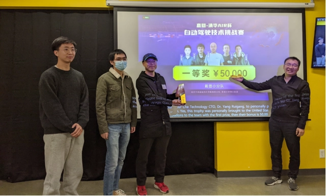 ▲嬴彻科技CTO杨睿刚博士在嬴彻硅谷办公室为冠军团队颁奖