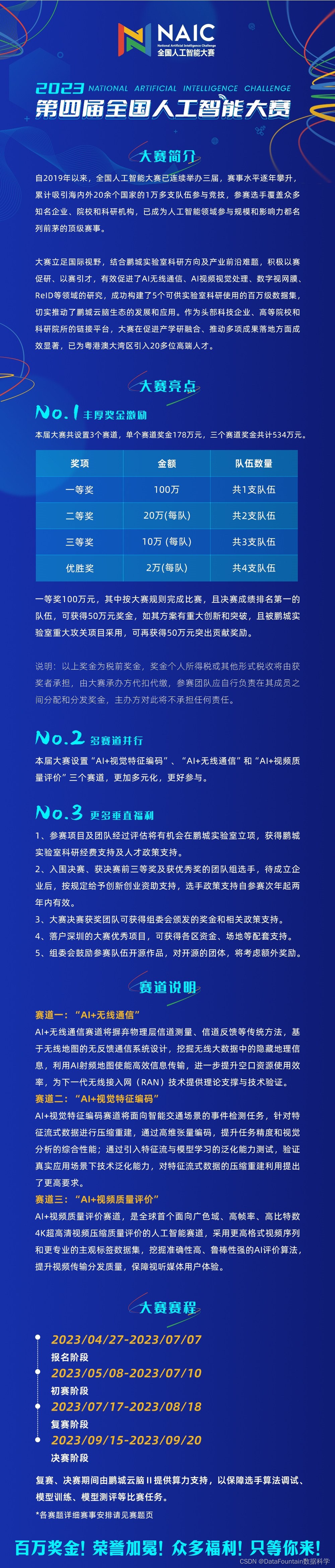 5月8日,三大赛道数据集正式上线,评测同步开启,选手可登录大赛官网下载数据集并提交结果。534万奖金等你来分!