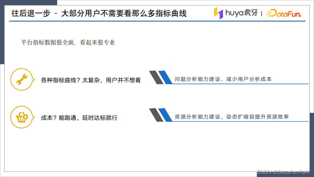 平台具有很全面的指标数据,但用户实际不需要了解这些东西。所以平台应该解决用户最关注的问题。同时对于任务的成本,平台应该尽可能帮助用户建立问题分析的能力,提升使用效率。