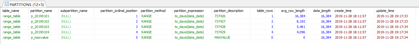 select table_name,partition_name,subpartition_name,partition_ordinal_position,partition_method,partition_expression,partition_description,table_rows,avg_row_length,data_length,create_time,update_time