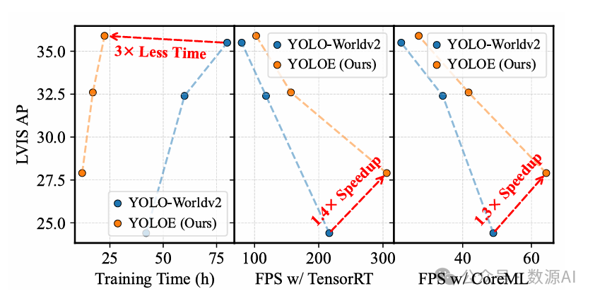 目标检测和分割在计算机视觉应用中被广泛采用,然而像YOLO系列这样的传统模型虽然高效且准确,但受限于预定义的类别,在开放场景中的适应性受到阻碍。近期的开放集方法利用文本提示、视觉线索或无提示范式来克服这一问题,但由于高计算需求或部署复杂性,往往在性能和效率之间进行折衷。在这项工作中,我们推出了YOLOE,它在一个高效的单一模型中集成了跨多种开放提示机制的检测和分割功能,实现了实时识别任何物体。对于文本提示,我们提出了可重参数化区域 - 文本对齐(Re - parameterizable Region - Text Alignment,RepRTA)策略。该策略通过一个可重参数化的轻量级辅助网络优化预训练的文本嵌入,并以零推理和迁移开销增强视觉 - 文本对齐。对于视觉提示,我们提出了语义激活视觉提示编码器(Semantic - Activated Visual Prompt Encoder,SAVPE)。它采用解耦的语义和激活分支,以最小的复杂度带来改进的视觉嵌入和准确性。对于无提示场景,我们引入了惰性区域 - 提示对比(Lazy Region - Prompt Contrast,LRPC)策略。它利用内置的大词汇表和专门的嵌入来识别所有物体,避免了对高成本语言模型的依赖。大量实验表明,YOLOE具有卓越的零样本性能和可迁移性,推理效率高且训练成本低。值得注意的是,在LVIS数据集上,YOLOE - v8 - S以更低的训练成本和的推理加速,比YOLO - Worldv2 - S的平均精度(AP)高出3.5。当迁移到时,与封闭集的YOLOv8 - L相比,在训练时间减少近的情况下,实现了的提升和0.4的提升。