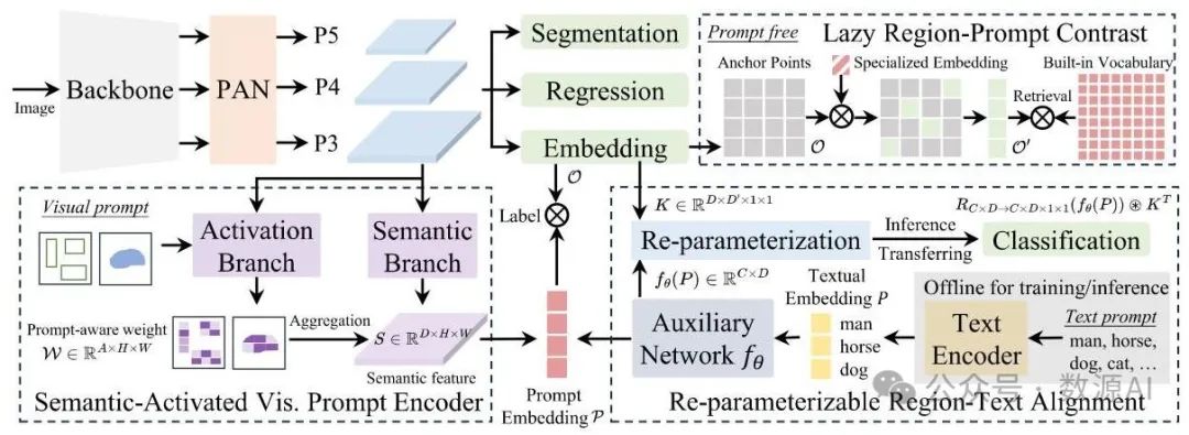 图2. YOLOE(一种目标检测和分割模型)概述,它支持多种开放提示机制下的检测和分割任务。对于文本提示,我们设计了一种可重新参数化的区域 - 文本对齐策略,以在零推理和迁移开销的情况下提高性能。对于视觉提示,采用SAVPE(一种视觉提示编码方法)以最小的成