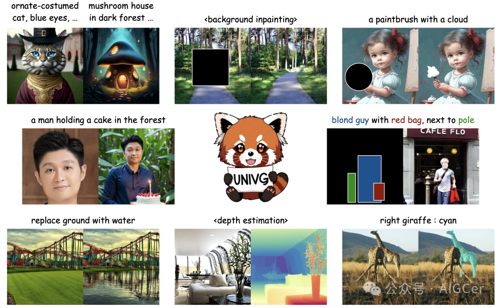 图2. 我们的通用视觉生成模型(UniVG)概述。UniVG包含一个文本编码器,用于从输入文本中提取提示嵌入,以及一个多模态DiT(MM-DiT),用于进行跨模态融合以实现潜在扩散。在这个过程中,所有视觉引导信息(潜在噪声、输入图像和输入掩码)都沿着通道维度连接成一个固定长度的序列,以提高效率。此外,可以通过嵌入替换注入外部条件,以实现进一步的控制。因此,通用的UniVG可以支持多种任务,如文本到图像生成、内外绘画、基于指令的编辑、布局引导生成和保留身份信息的生成。我们还考虑了辅助任务,包括深度估计、姿态估计和指代表分割,以增强其视觉场景感知能力。
