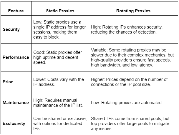 在静态代理和轮换代理之间做选择,最终还是要回到你的项目需求上。在决策之前,最好从安全性、性能、价格以及维护成本这几个维度综合考虑。